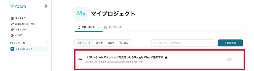 マイプロジェクトにテンプレートがコピーされます。赤枠内のタイトルをクリックすると、フローボットの設定画面に移動します。