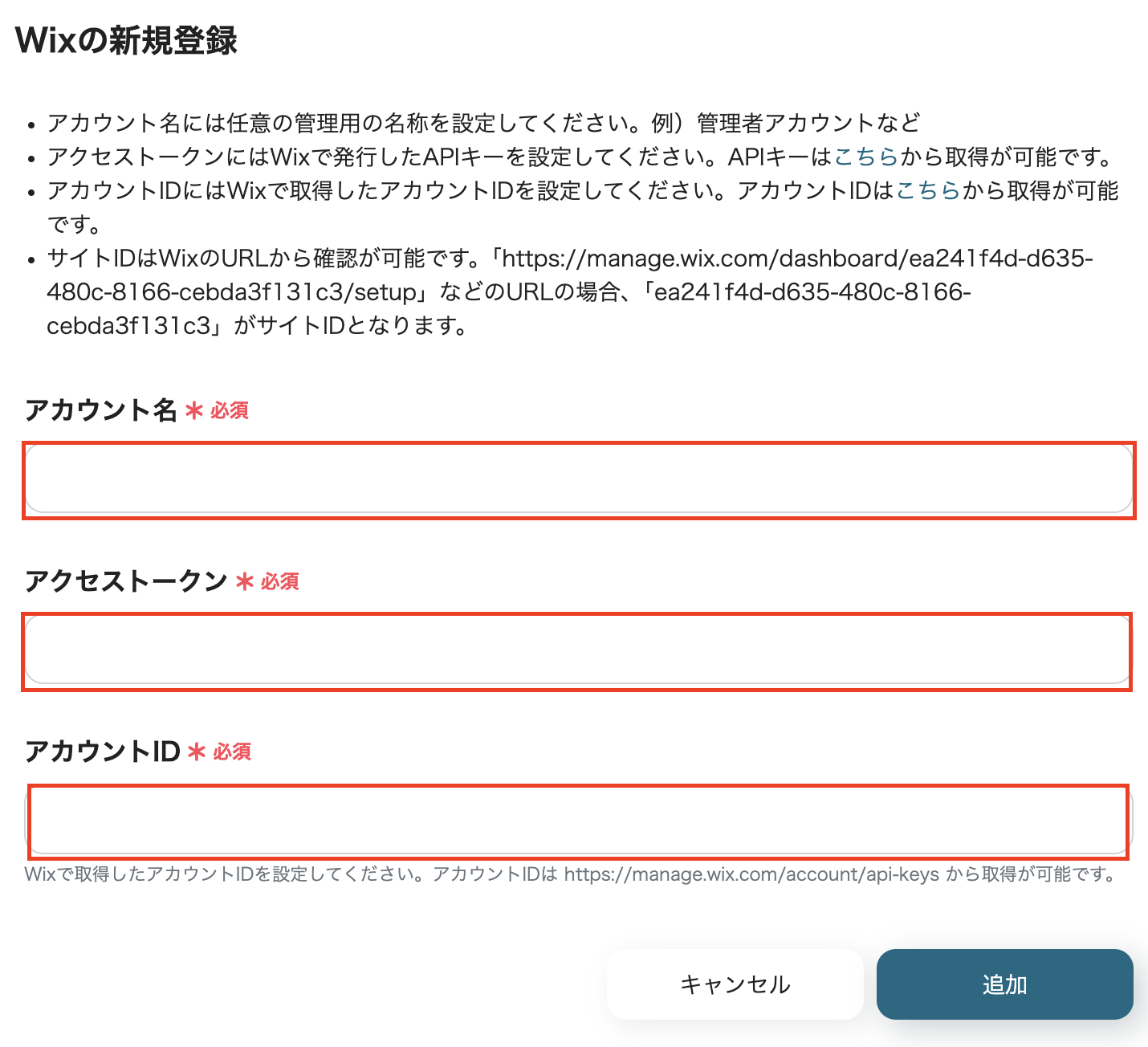 ・入力したい項目をWixのアウトプットから選択して入力してください。