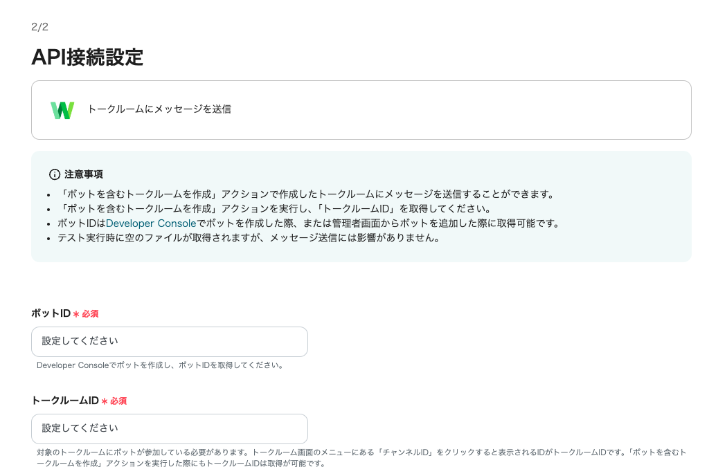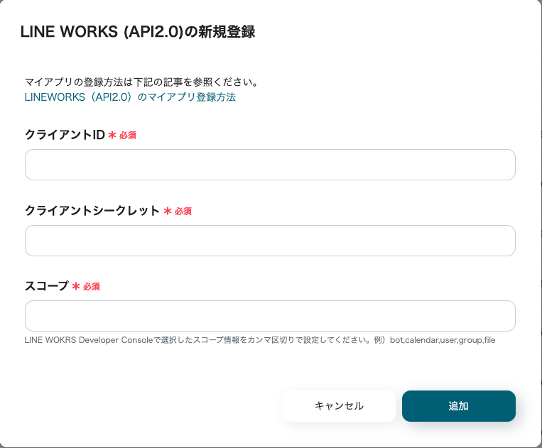 各項目にLINE WORKSのDeveloper Consoleから取得した情報を入力し、追加ボタンをクリックします。