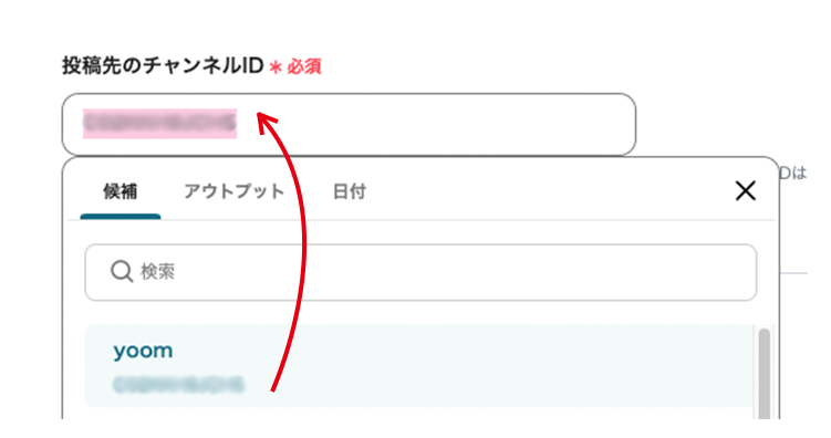 - 編集欄をクリックするとプルダウンが開き、Slackのワークスペースのチャンネル候補が表示されます。通知するチャンネルを選択すると、自動でIDが引用されます。