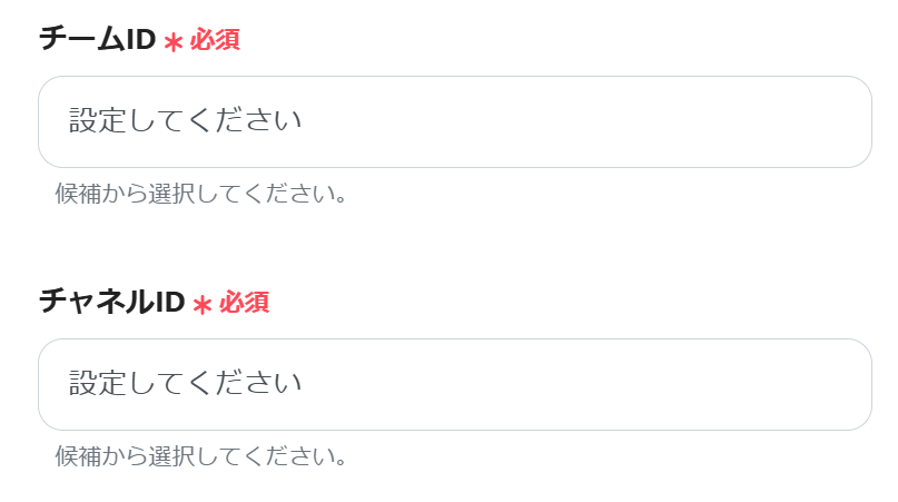 以下の画面が表示されたら、「チームID」と「チャネルID」を設定します。