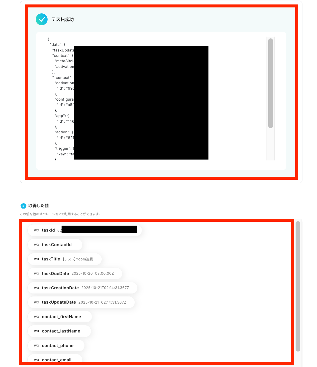 テストに成功すると、Wixの期限切れタスクのデータが反映されます。内容を確認できたら「保存する」をクリックしましょう。