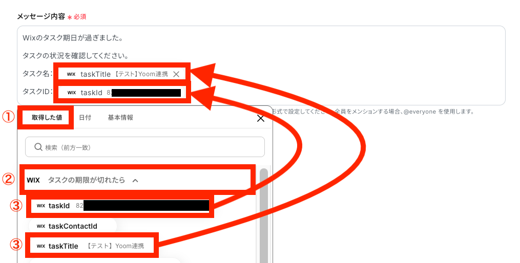 ③「taskId」や「taskTitle」など埋め込みたい項目を選択