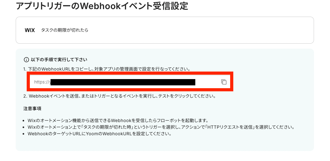 Wixの画面でもWebhookの設定をするため、赤枠内のURLをコピーします。