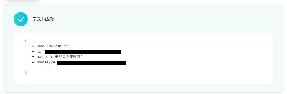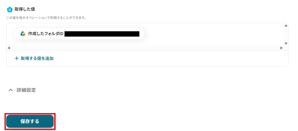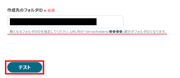 「フォルダ名」は、作成するフォルダの名前を入力します。ここに先ほどのテストで取得した値を挿入しましょう。