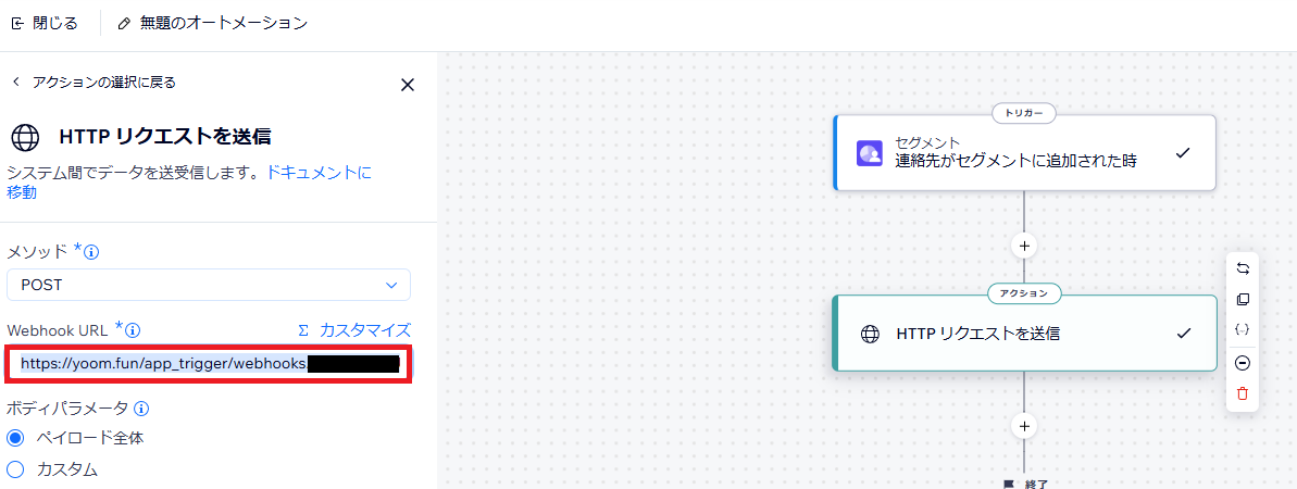 を選択し、アクションのWebhook URLに先ほどコピーしたURLを貼り付けてください。