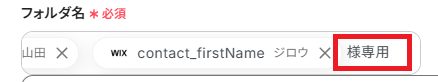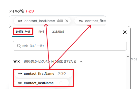 Wixのアクション設定で「取得する値」を追加し、使用することで自由な組み合わせでフォルダ名を設定できます。