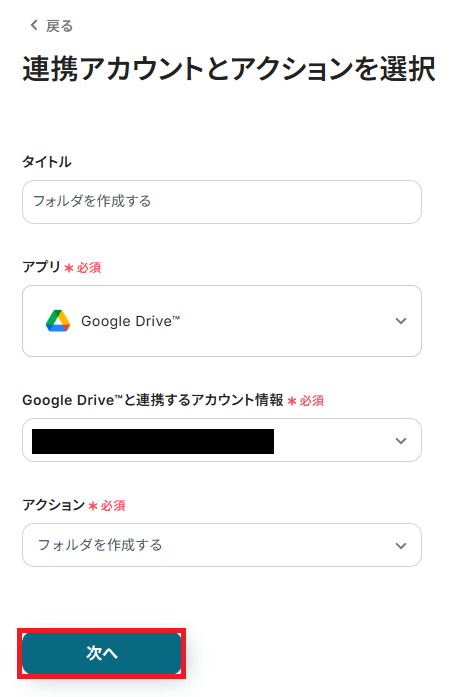 Google Driveと連携するアカウントに間違いがないかを確認し、「次へ」をクリックしましょう。