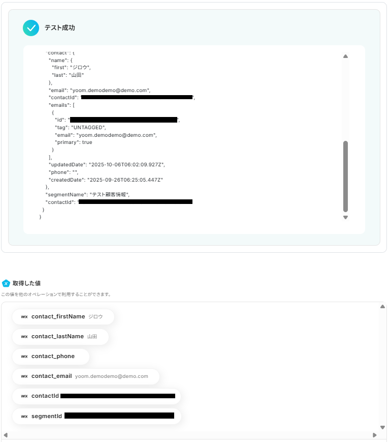テストが成功すると、Wixのデータを含んだテスト成功画面と取得した値が表示されます。取得した値はこのあとの設定でも使用します。