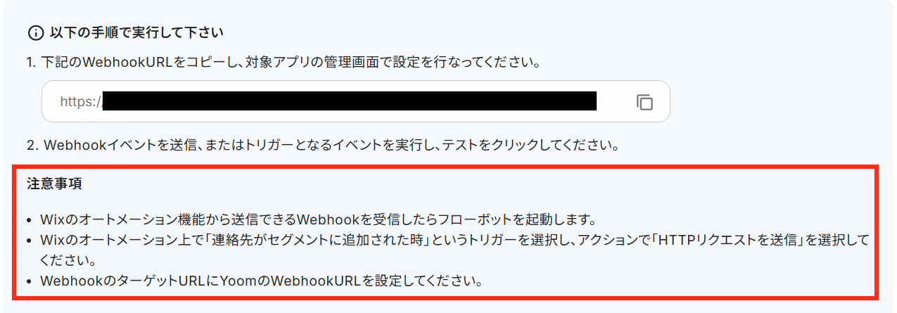 画面の案内に沿って、WixのWebhook設定をおこないます。Webhookの設定を行うことでリアルタイムでフローを起動させることが可能です。
