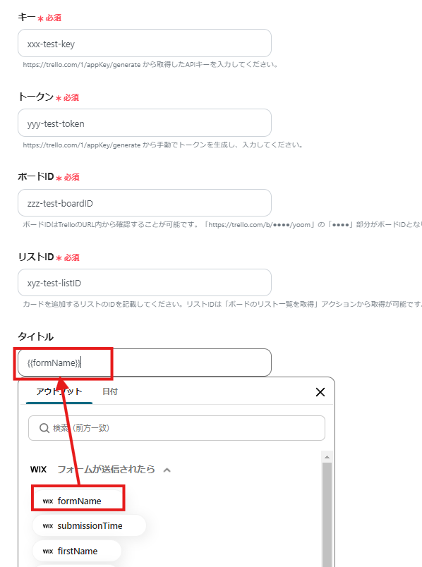 「キー」「トークン」「ボードID」「リストID」は必須項目になっているので、必ず入力してください。