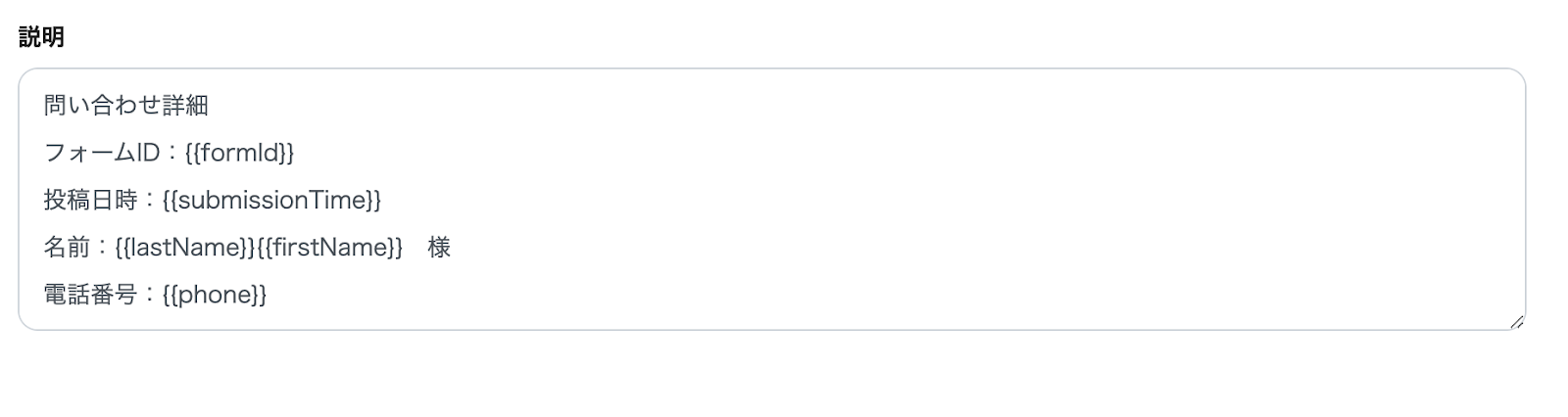 あらかじめ、「フォームID」や「投稿日時」が含まれるように記載されているので、適宜変更を加えてください。