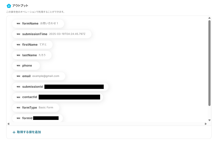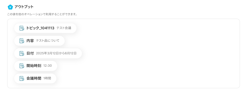 ※表示されているアウトプットは「この値を他のオペレーションで利用することができます。」と表記があるように、次の設定で使用します。