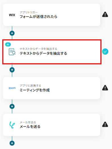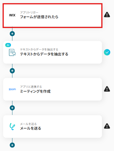 ※以下の画面は、Yoomページ画面左側「マイプロジェクト」のフローボットで表示される、「【コピー】Wixからフォームが送信されたらZoomミーティングを作成し、参加者にメールを送信する」をクリックすると表示されます。