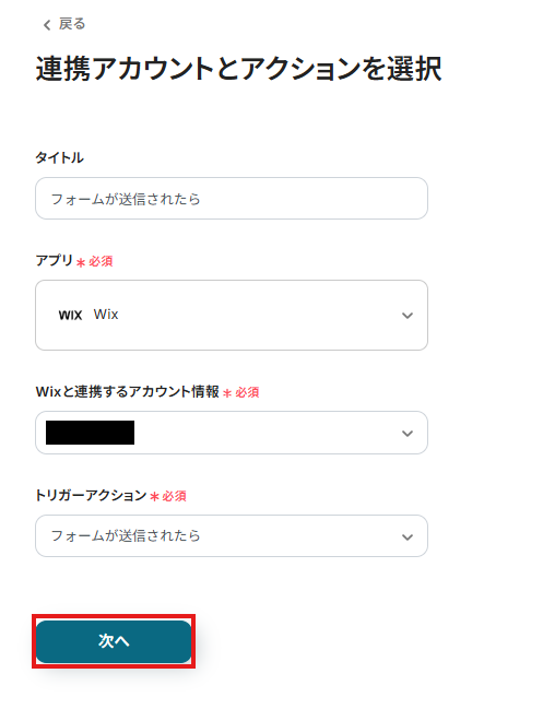 2.表示された画面で必須項目を入力します。トリガーアクションはそのままにして、「次へ」をクリックしましょう。