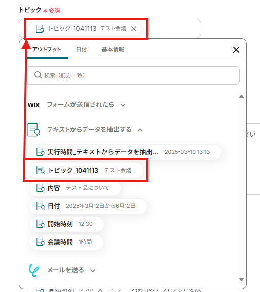 「トピック」「会議の説明」「開始日時」「会議時間」は、入力欄をクリックして表示されるアウトプットから選択できます。