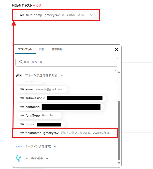 2.「対象のテキスト」は、入力欄をクリックして表示されるアウトプットから選択してください。