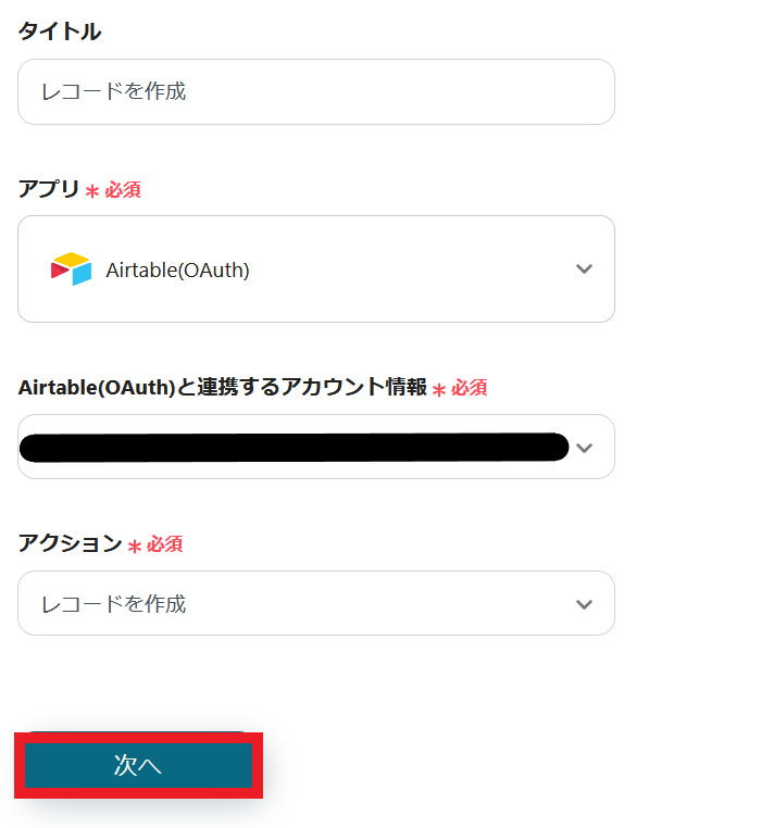 2.Airtableと連携するアカウント情報を入力します。