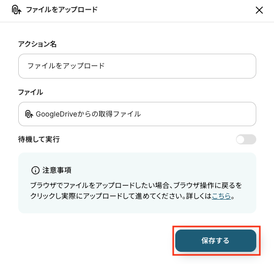 - アクション名:任意設定(例:「ファイルをアップロード」)