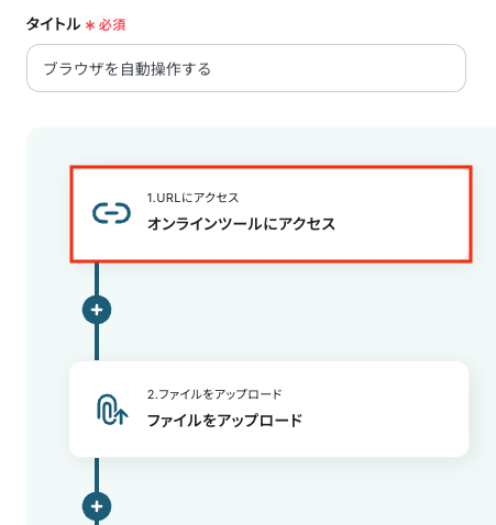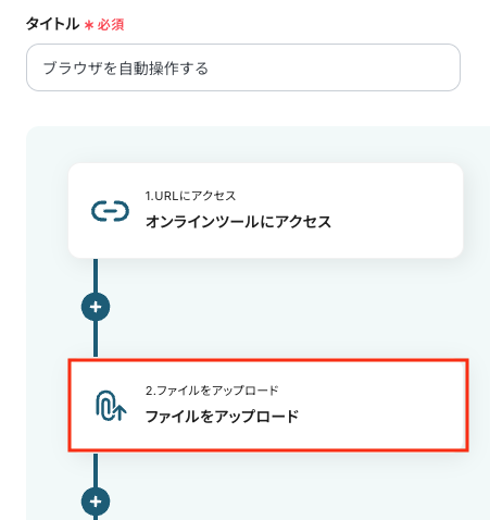 - アクション:任意設定(例:「ファイルをアップロード」)