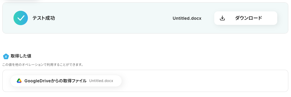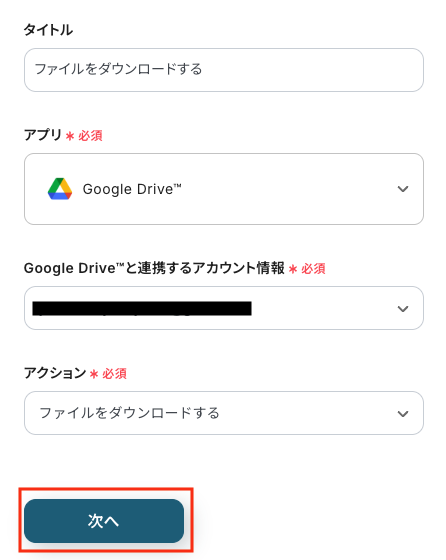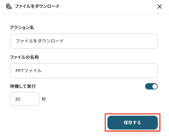 - アクション名:任意設定(例:「ファイルをダウンロード」)