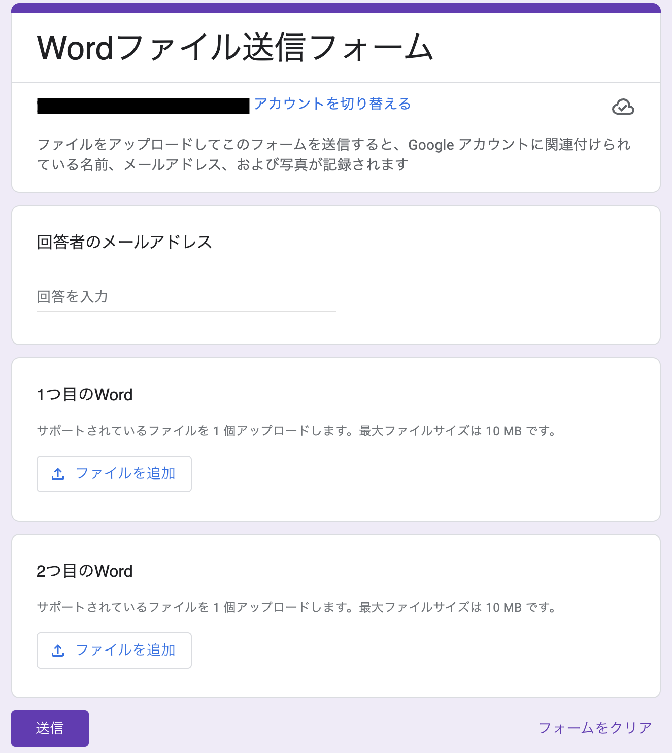 - テストでエラーが表示された場合は、Google フォームでWordファイルを送信してみてください。