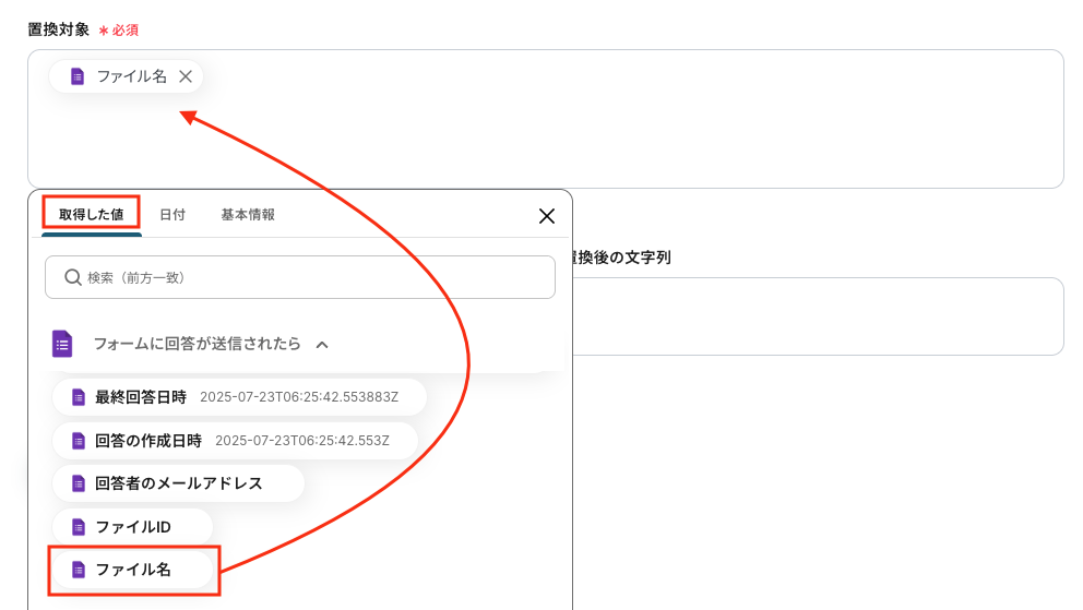 - ファイルの添付方法:任意設定(例:「取得した値を使用する」)