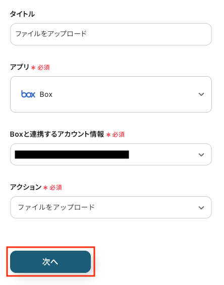 - Boxと連携するアカウント情報:アカウントを選択