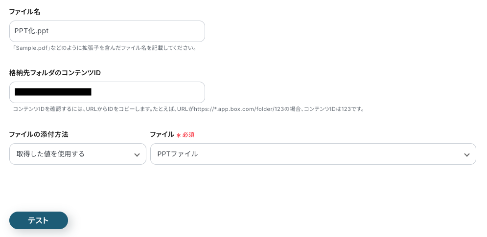 テストを実行し、BoxにPowerPointがアップロードされていれば、設定完了です。
