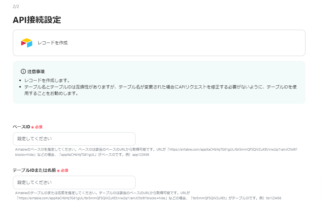まずは、Airtableのレコードを作成する場所を指定するための項目を入力しましょう。