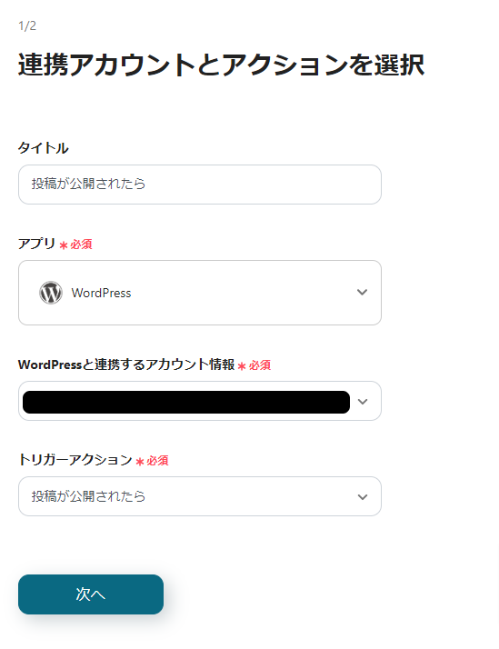 タイトル・トリガーアクションは変更不要なので、アカウント情報を確認して「次へ」をクリックしてください。