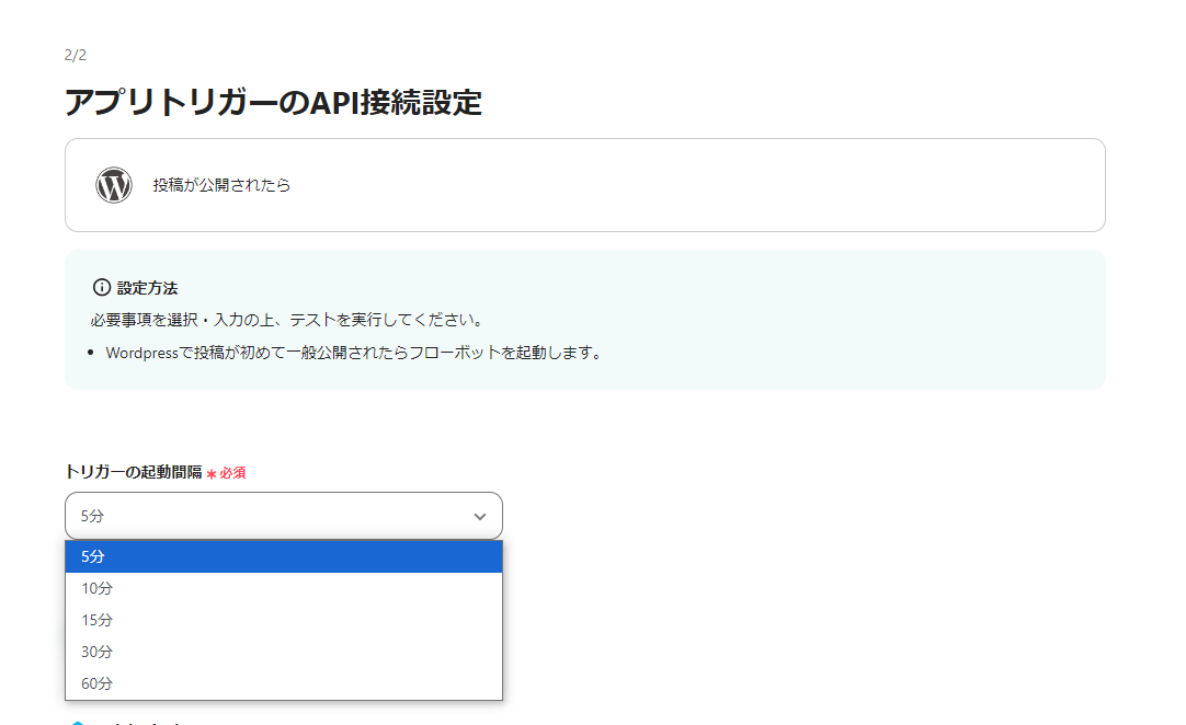 次のページでは「何分おきに記事の公開があるかを確認する」ための設定を行います。