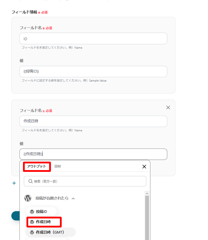 フィールド名は手動入力、値はフィールド名と一致するようにアウトプットから選択します。