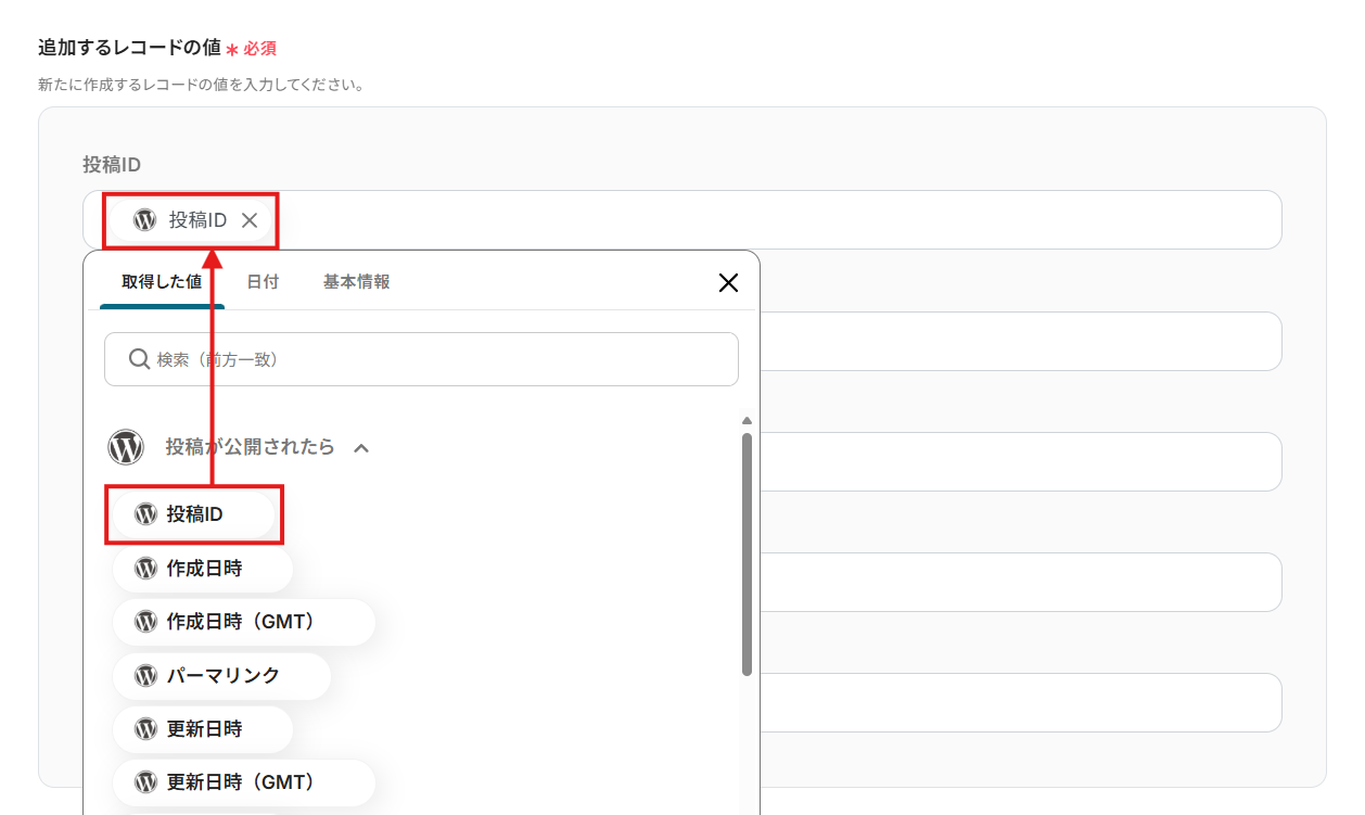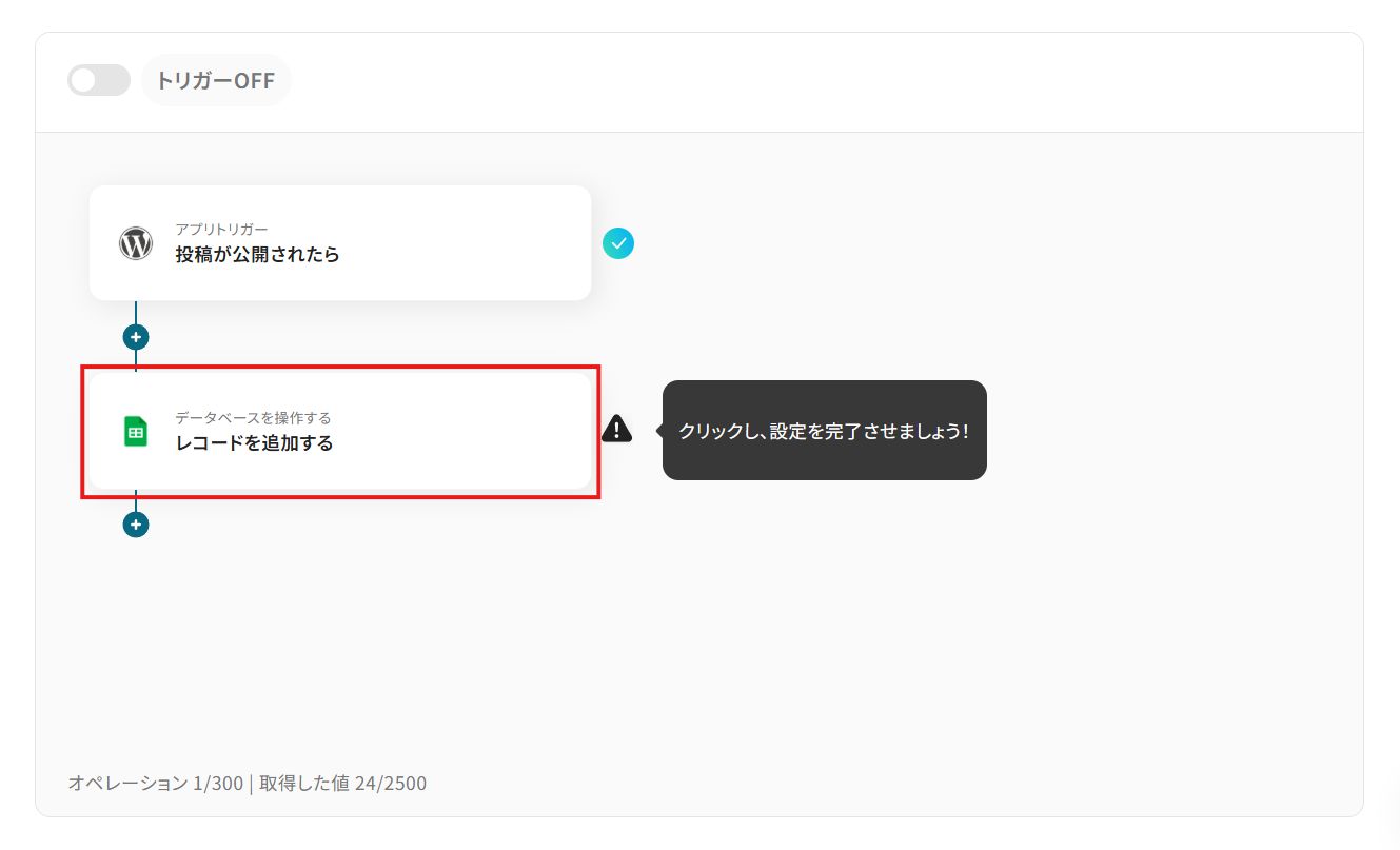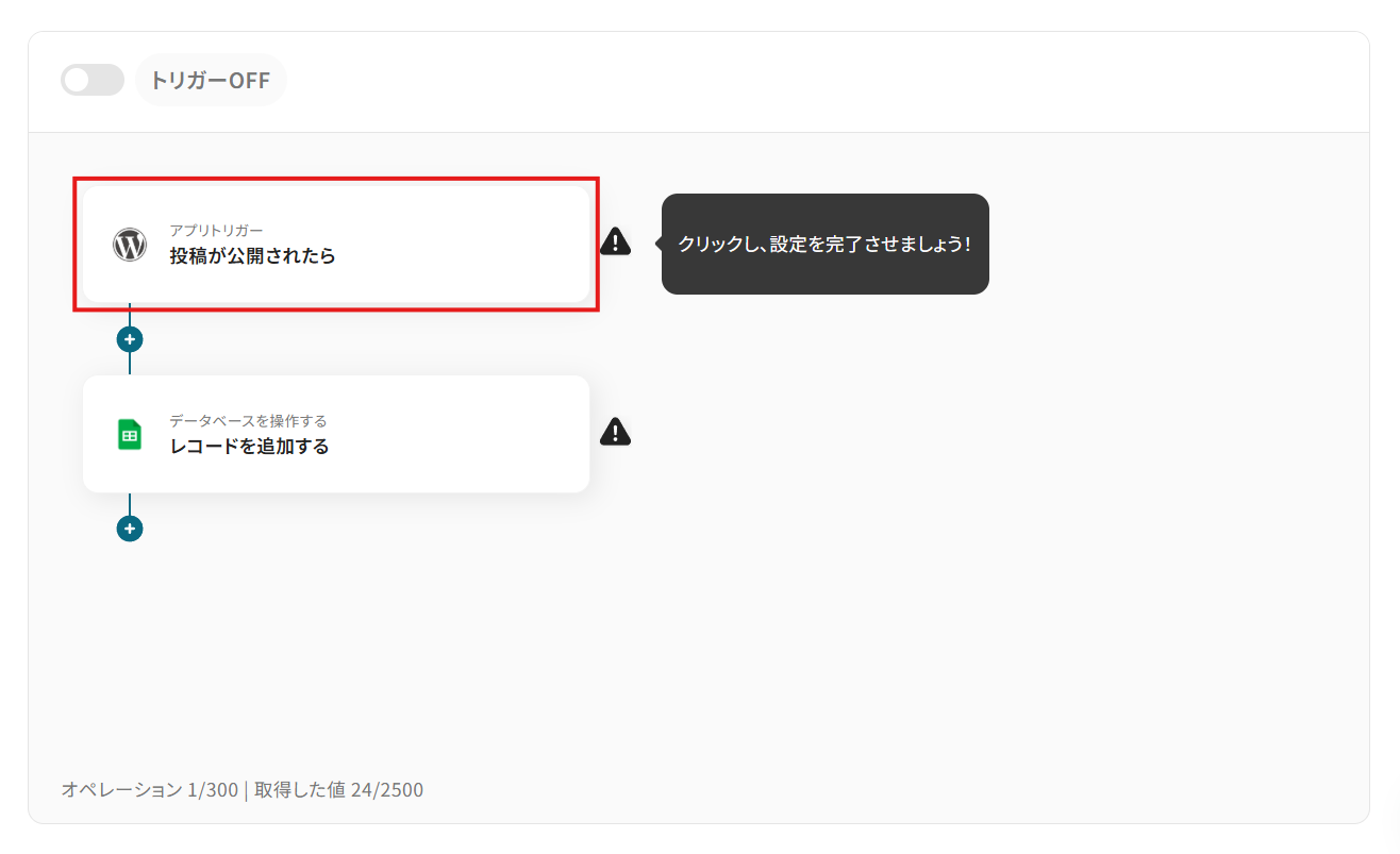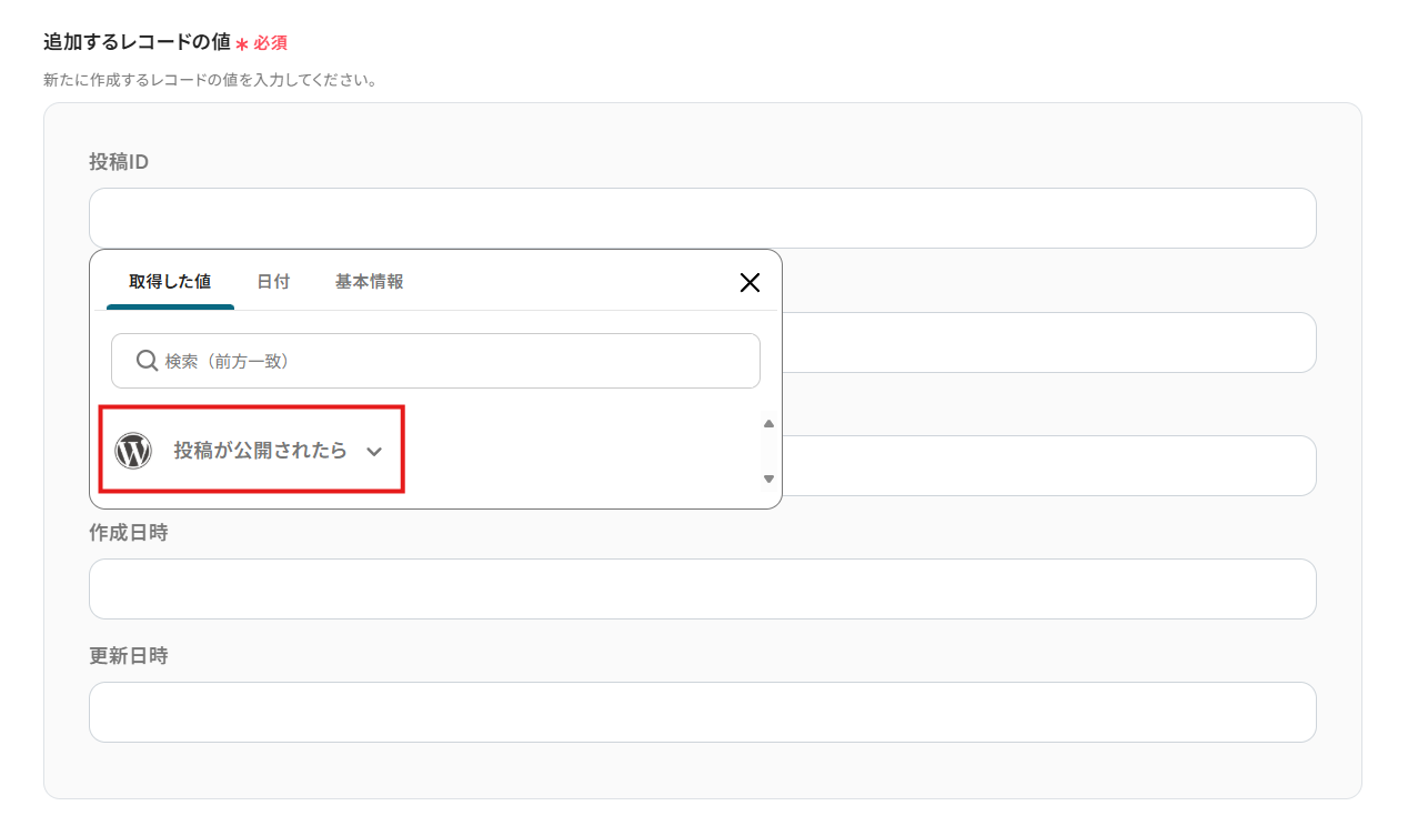 WordPressの「投稿が公開されたら」というアクションを自動化の起点として使用することで、記事コンテンツの公開と同時に、その情報を別のデータベースアプリに自動で追加・蓄積できます。