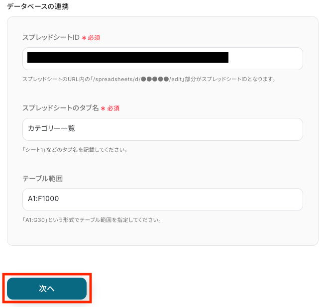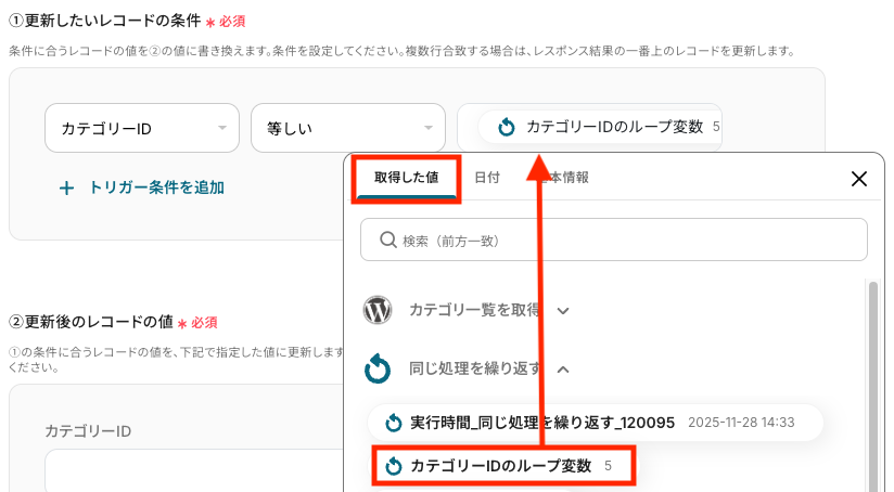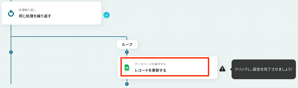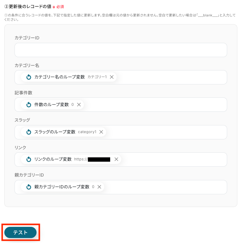 - 最後に、繰り返し処理の中で、Google スプレッドシートの「レコードを更新する」アクションを設定し、カテゴリ情報を指定のスプレッドシートに上書きする