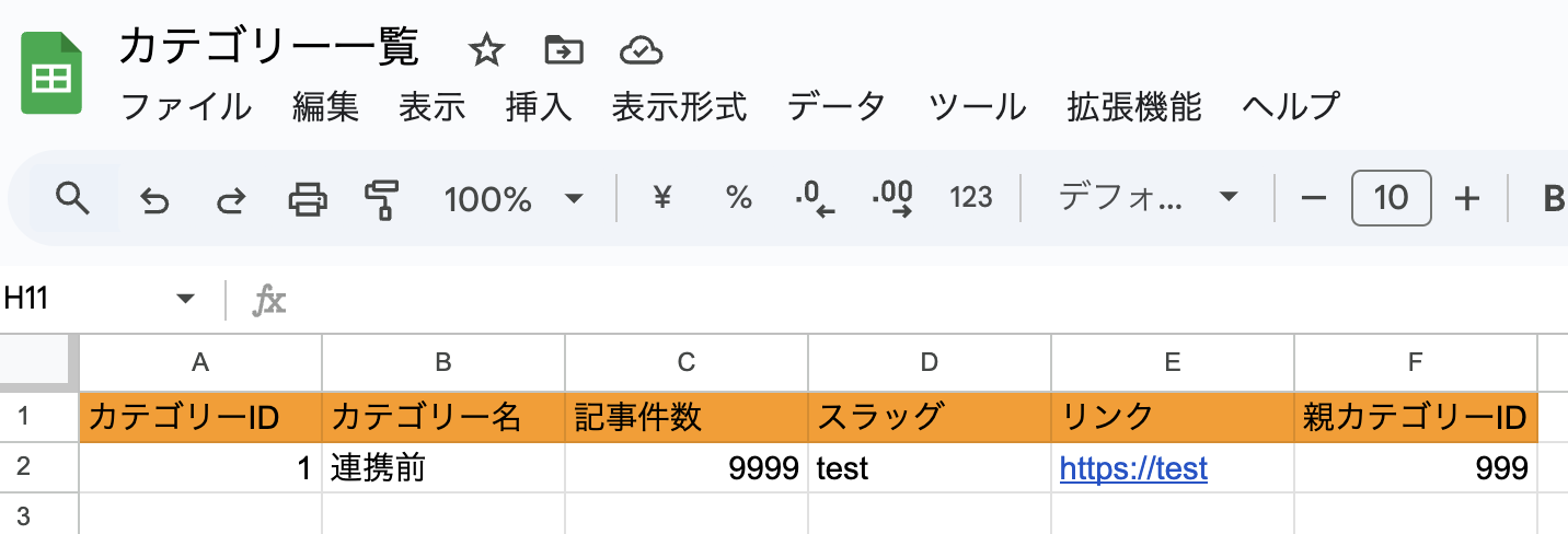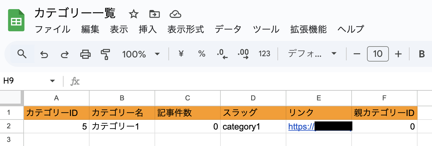 フローを構築する前に、WordPress.orgのカテゴリー情報を記録するためのGoogle スプレッドシートを準備します。