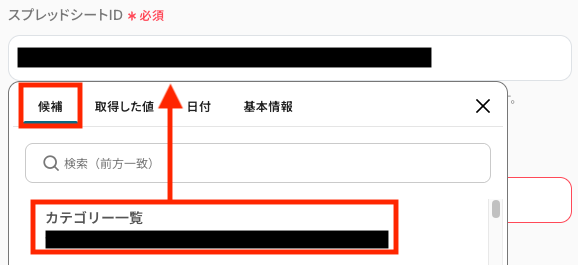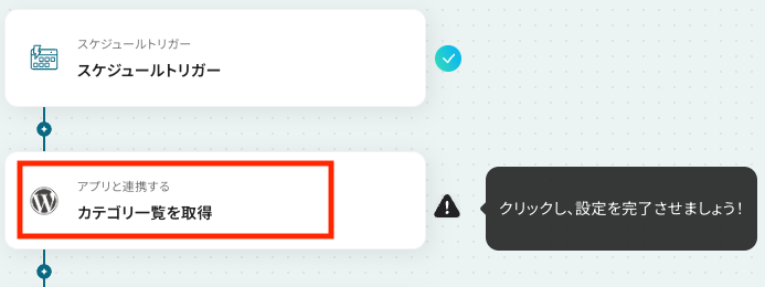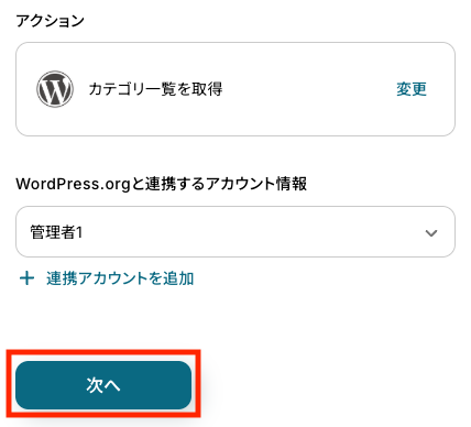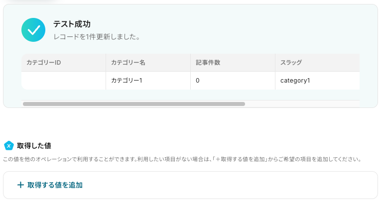- アクション:「カテゴリ一覧を取得」が自動で選択されています。