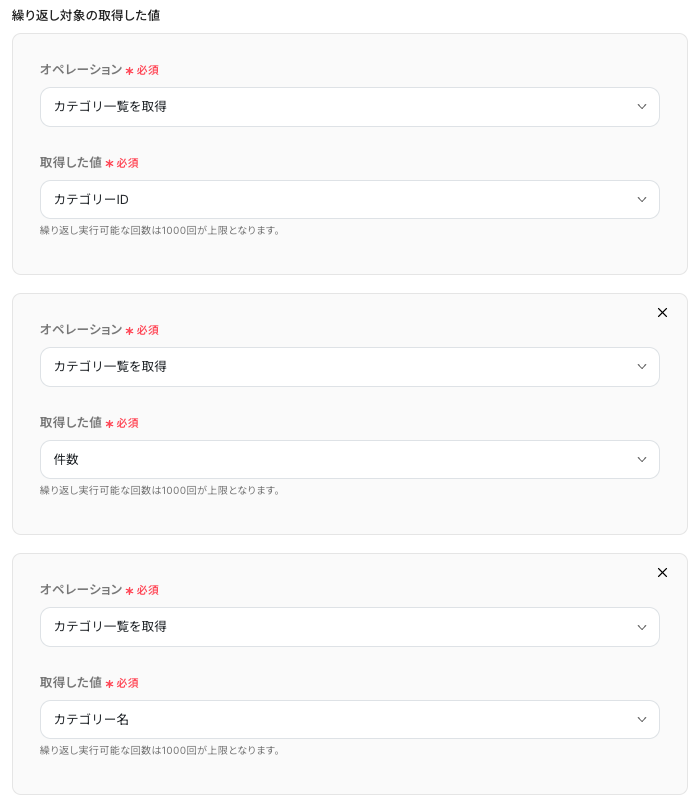 - 次に、取得したカテゴリ情報それぞれに対して処理を行うため、繰り返し処理のアクションを設定する