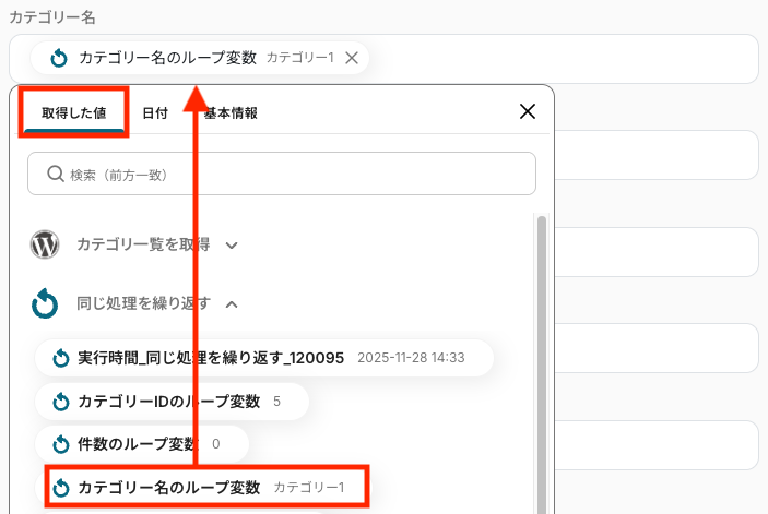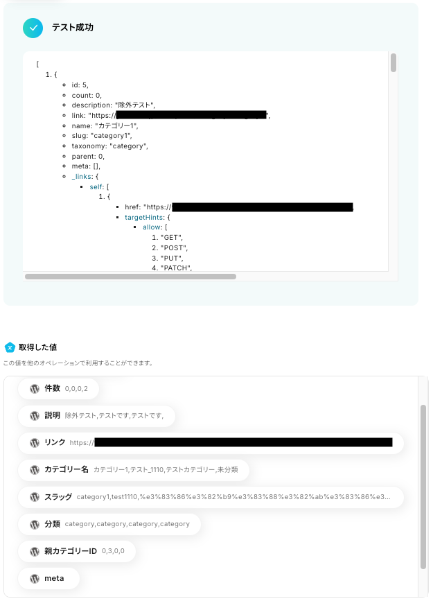 - 投稿ID:特定の記事に紐づくカテゴリー情報を取得したい場合に候補から選択してください。