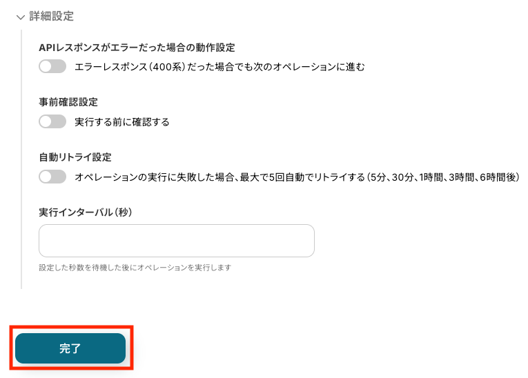 自社の運用方針に合わせて設定できたら、「完了」をクリックします。