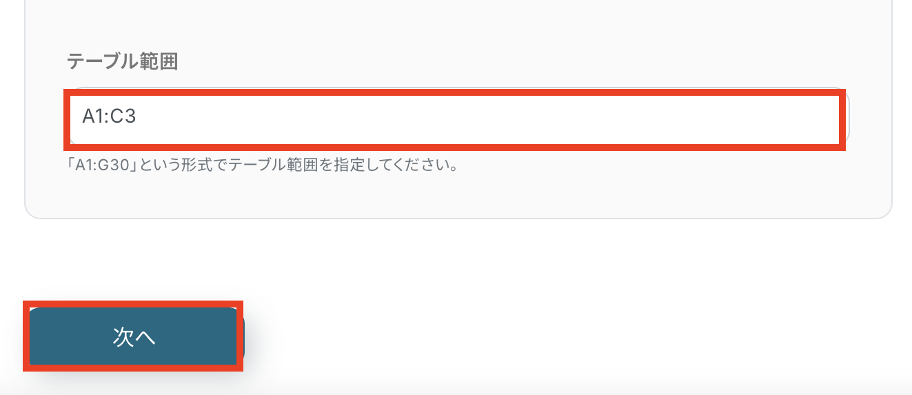 「テーブル範囲」は、Google スプレッドシートに合わせて入力します。