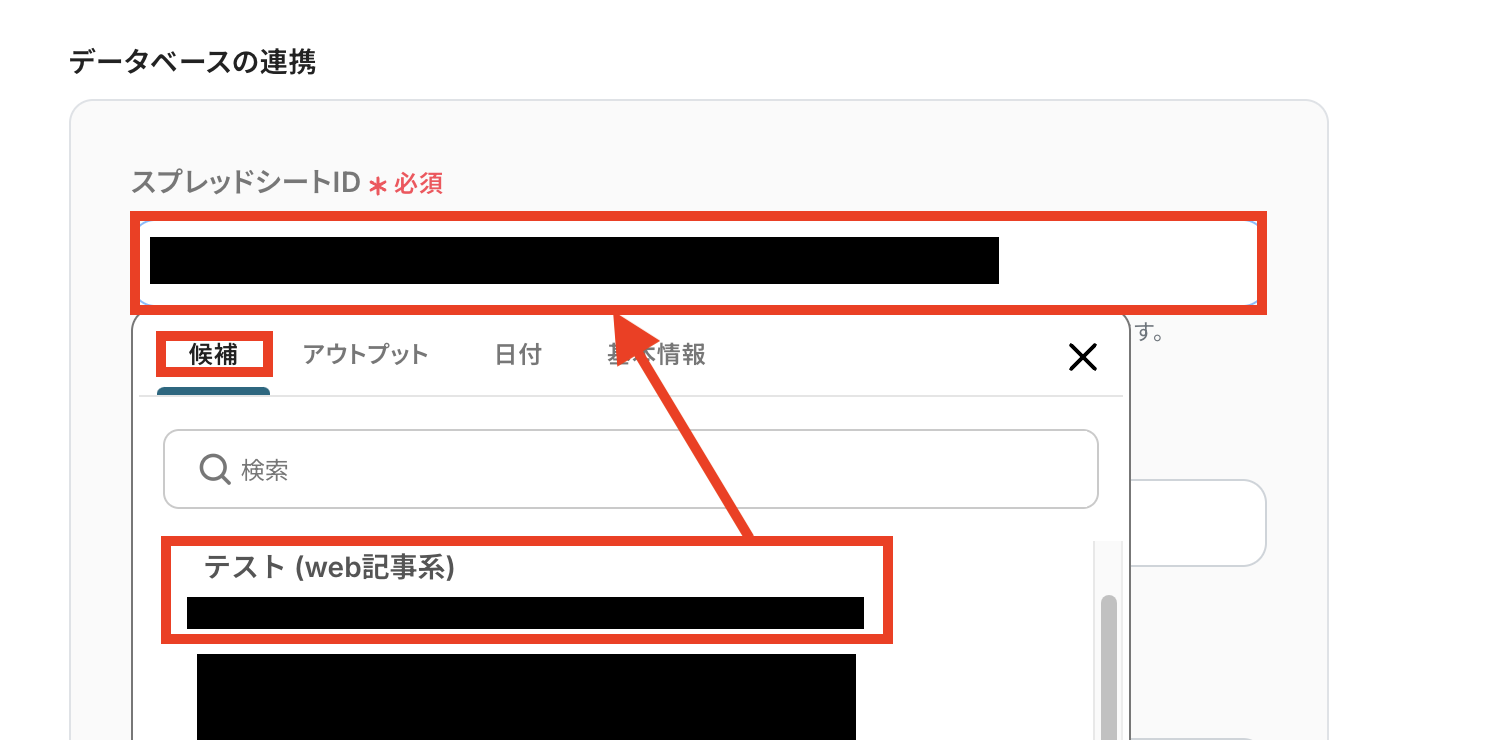 「スプレッドシートのタブ名」も入力欄をクリックすると、候補が表示されます。