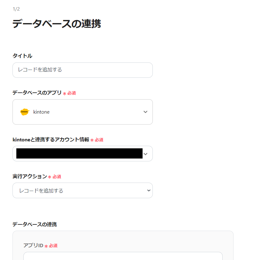 2) アクションは「レコードを追加する」を選択して、アプリIDを入力し、「次へ」をクリックします。
