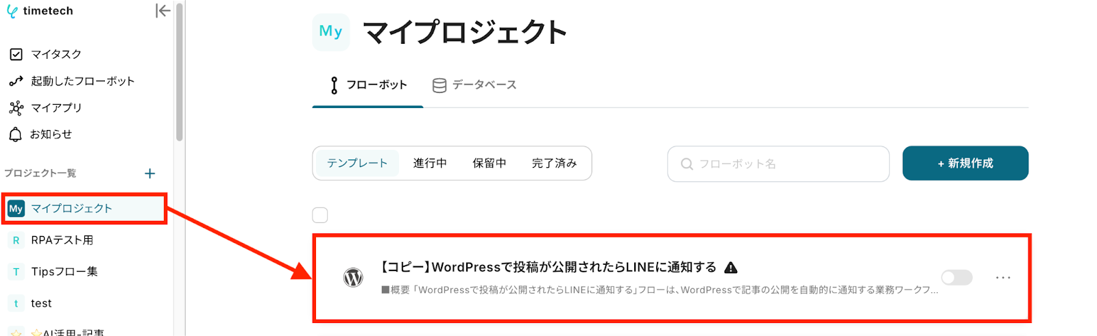 左側にあるメニューの「マイプロジェクト」から、コピーしたテンプレートを開きます。