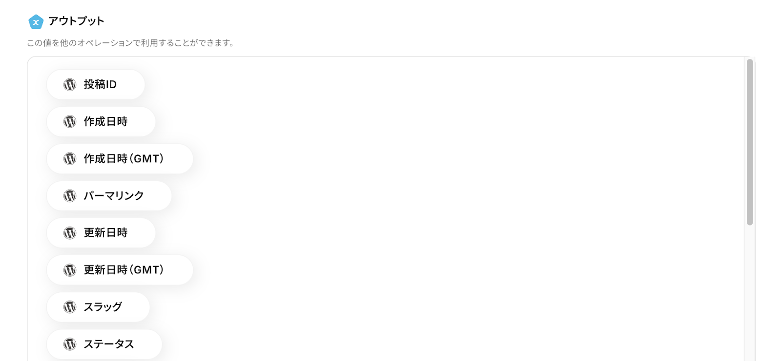(画像には表示されていませんが、実際には項目の横にアウトプットされた具体的な値が表示されます。)