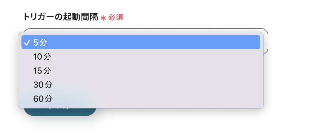 「トリガーの起動間隔」を5分・10分・15分・30分・60分から選択してください。