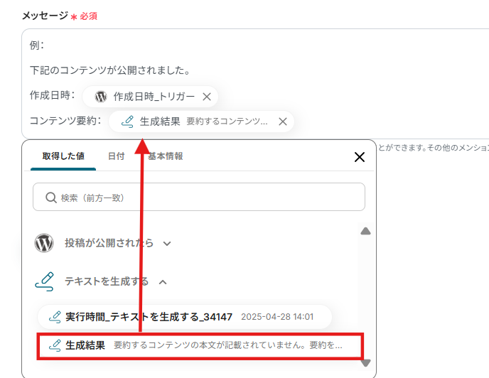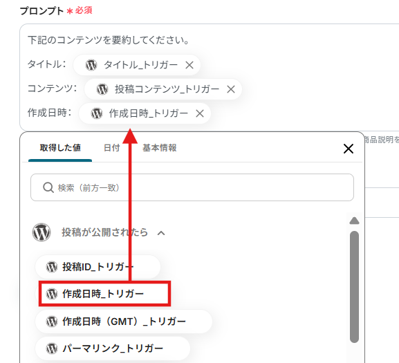 AIへの指示内容をテキストで設定し、WordPressのアウトプットから以下のように選択してください。