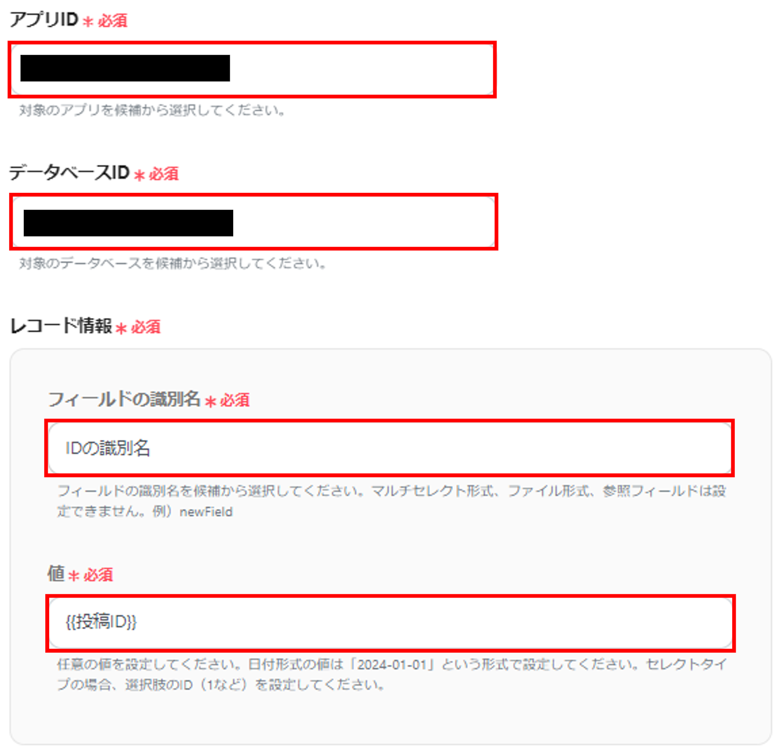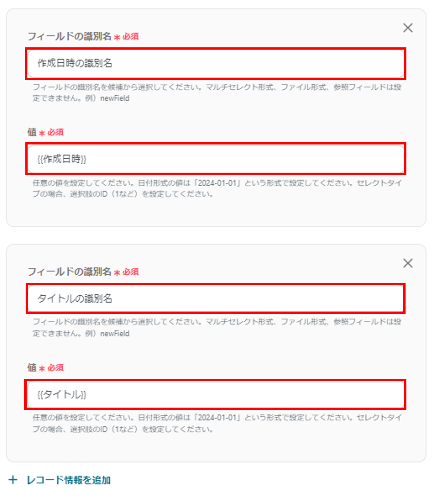 (11)レコード情報では、フィールドの識別名を入力し、値には「投稿が公開されたら」のアウトプットから該当するものを任意で選択します。
