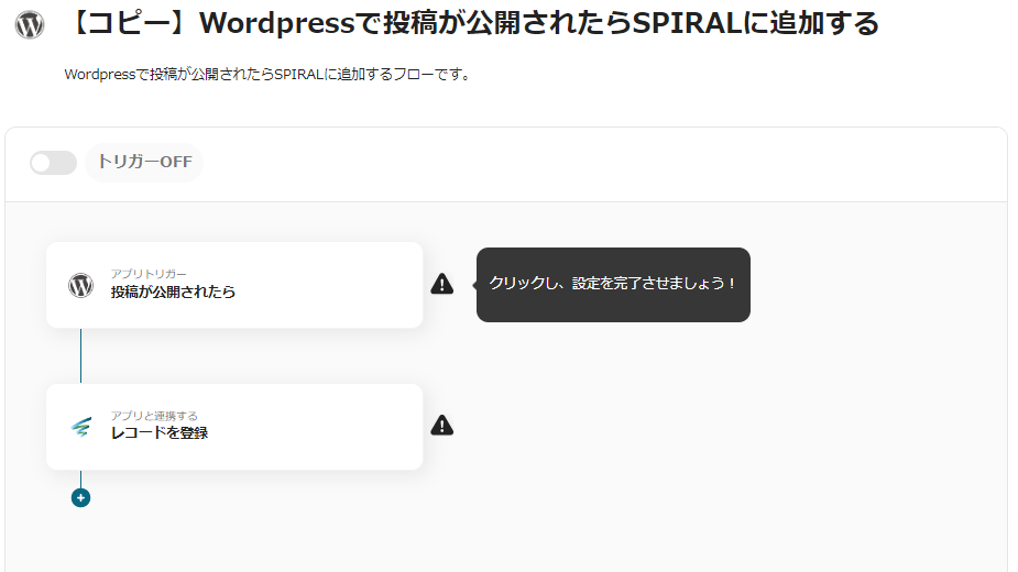 ここでは「WordPressで投稿が公開されたらSPIRALに追加する」フローの設定についてご紹介します。