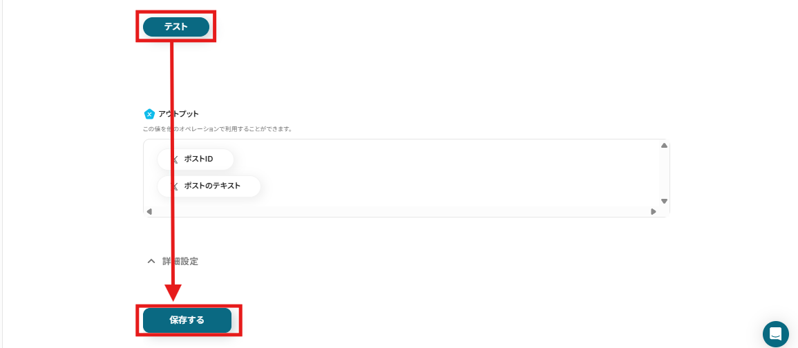テストが成功したらアウトプットが取得されます。確認できたら「保存する」を押しましょう!